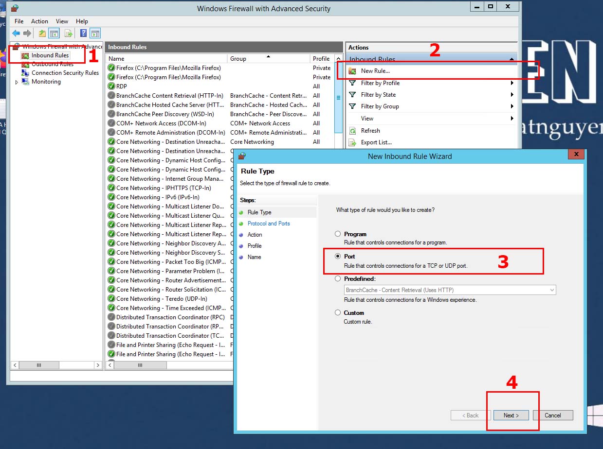 Sau khi đổi cổng rdp thì ae vẫn chưa xài được nghe, cần phải cấu hình lại tường lửa mở để port ae tùy chỉnh hoạt động được, các cấu hình như sau: