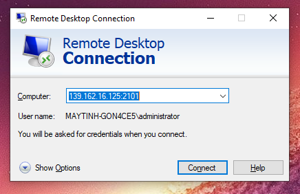 Ví dụ tui đã đổi port rdp thành 2101 thì khi mở remote desktop lên ae phải nhập vào ô IP theo đinh dạng là: ip:port