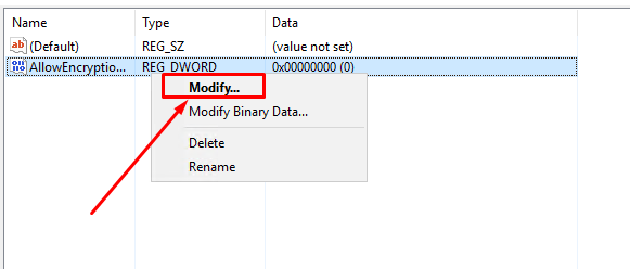AllowEncryptionOracle -> Chuột phải chọn Modify