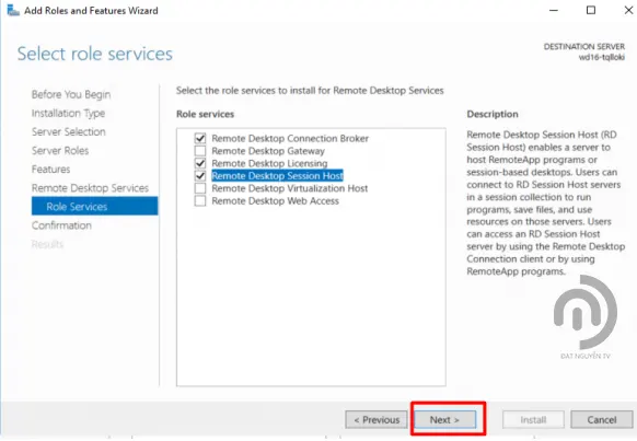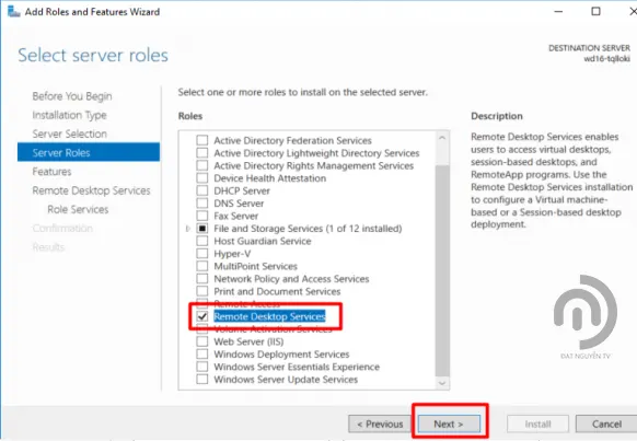 - Ở bước này tick chọn Remote Desktop Services và nhấn Next