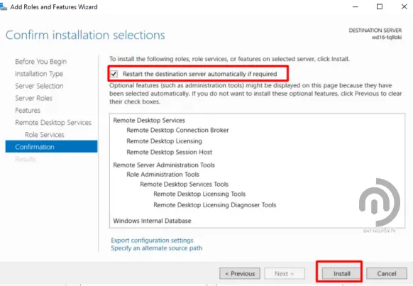 - tick vào ô “Restart the destination server automatically if required” và nhấn vào nút Install. sau khi hệ thống cài đặt xong sẽ tự động khởi động lại, như vậy là bạn có thể tạo được nhiều user và đăng nhập cùng lúc vào 1 vps rồi