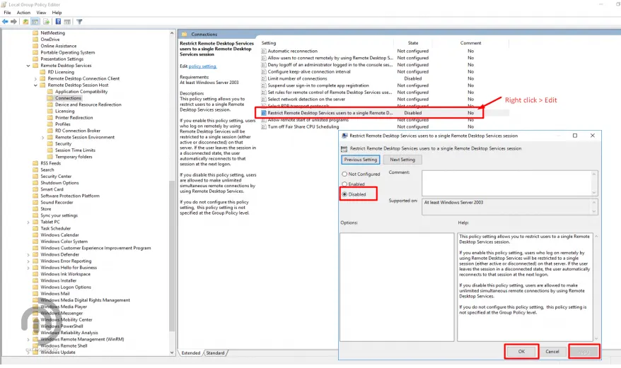 - Click đúp vào Restrict Remote Desktop Services user to a single Remote Desktop Services session cài đặt thành Disabled.