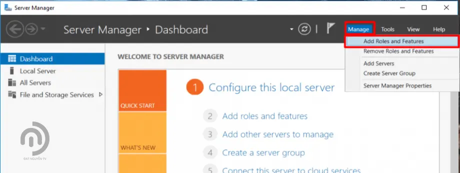 - Khi Server Manager khởi động hoàn tất, bạn chọn Manage > Add Roles and Features