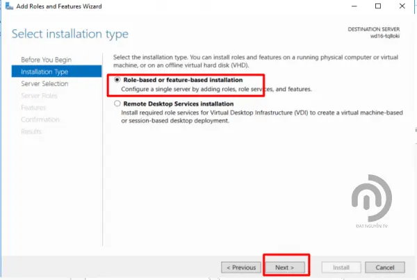 - Tick chọn vào mục Role-based or feature-based installation rồi nhấn Next