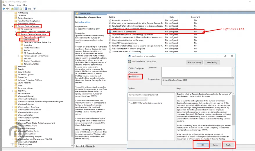 - Double click Limit number of connections. Chọn Disable rồi nhấn OK để không giới hạn kết nối truy cập. Ngoài ra, bạn cũng có thể chọn Enable để nhập số lượng kết nối được phép truy cập ở phần RD Maximum Connections allowed. Chọn xong bạn nhấn Apply, tiếp đó nhấn OK để lưu