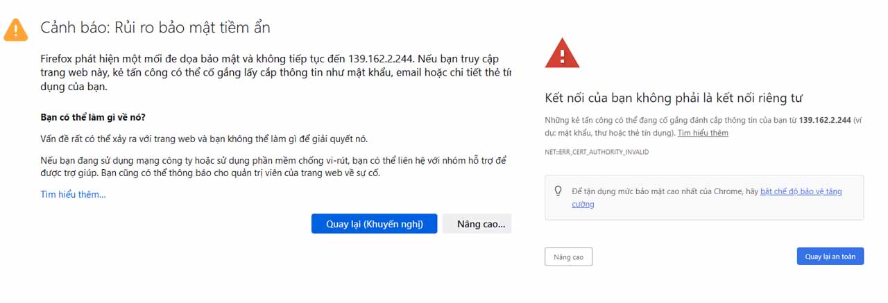 khi truy cập trình duyệt sẽ báo “Kết nối của bạn không phải là kết nối riêng tư” đối với chrome, còn firefox thì sẽ báo là “Cảnh báo: Rủi ro bảo mật tiềm ẩn” ae đừng lo lắng, vì chua được cài ssl nên các trình duyệt sẽ hiện thông báo này. ae click vào nâng cao và chọn tiếp tục hoặc là chấp nhận rủi ro thì sẽ truy cập được.