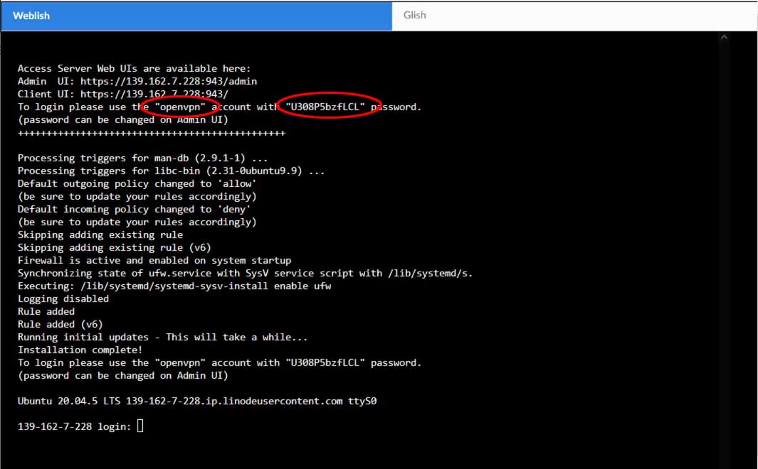 Sau khi tạo xong vps ae chờ tầm 1-2p, ae mở cửa sổ console lên sẽ thấy password để đăng nhập vào admin openvpn, mở console lên ae chú ý mấy dòng đầu tiên như hình bên dưới.